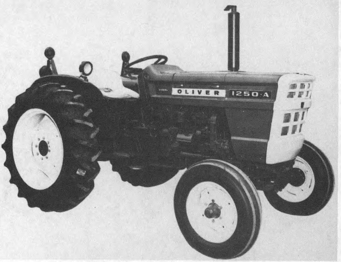 In 1969 the Oliver 1250-A tractor superseded the earlier 1250 model. This Fiat-built design from Italy was manufactured to White-Oliver specifications, and was furnished only as a diesel tractor. Rated at 38 1/2 Certified Horsepower, the 1250-A used a three-cylinder, direct-injection engine having a displacement of 142.8 ci. This model could be furnished as a Utility tractor with an adjustable front axle, a special Vineyard tractor, and with a four-wheel-drive option. Oliver 1250-A tractors were offered only in 1969.